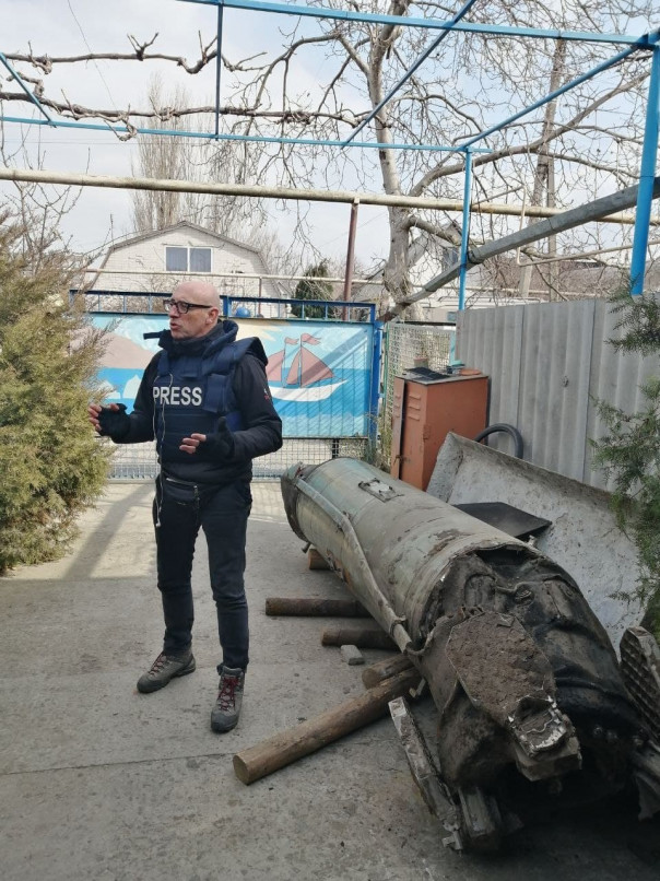 После этого репортёры со всего мира осмотрели места падения и поражения кассетными боевыми частями ракеты Точка-У, выпущенной по мирному городу боевиками ВСУ Зеленского.