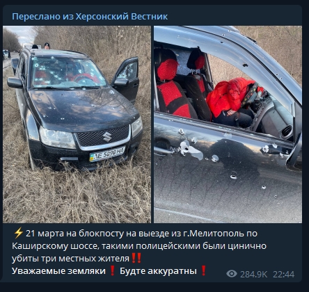 17 и 21 марта группа полицейских и тероброновцев без объяснения причин расстреляла машины мирных жителей, пытавшихся покинуть Запорожье по Никопольскому шоссе. 5 невинных людей были убиты, ещё 3 получили ранения. Местные Тг-каналы публикуют кадры с места трагедии.