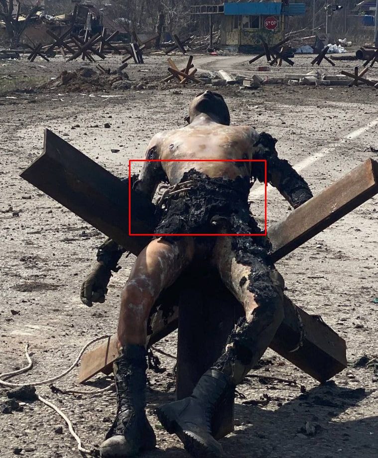 Я всегда не сразу решаюсь публиковать такие материалы, но мир должен видеть истинное лицо украинского нацизма. Украинские социальные сети распространяют это фото и смеются над трупом русского солдата. Однако, если присмотреться, то можно заметить, что русского солдата приковали цепями к стальному противотанковому ежу, после чего пытали, а потом, судя по фото, живьём подожгли. Украина - ИГИЛ в центре Европы.