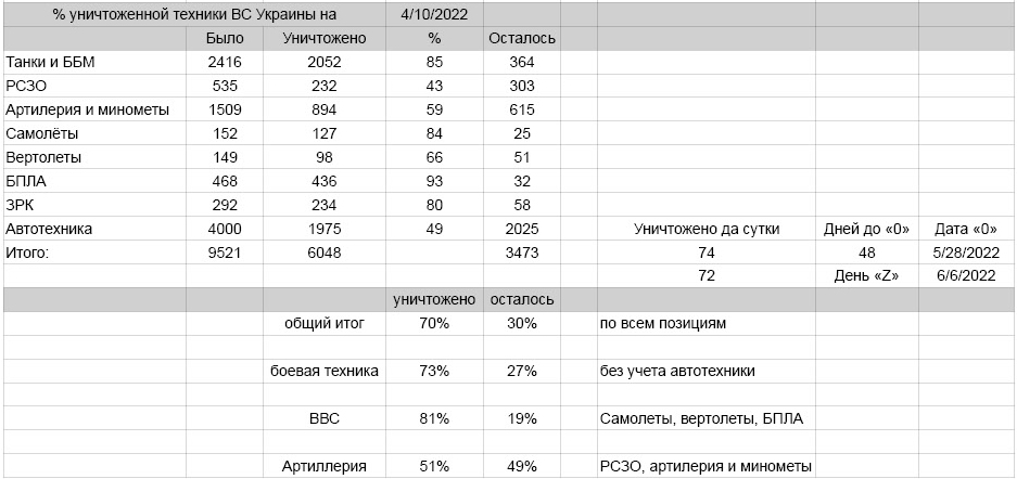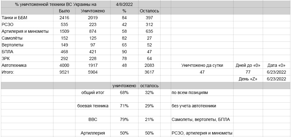 Имея среднее значение уничтоженной боевой техники ВСУ за сутки и имея оставшееся её количество, простым действием вывел количество дней до полной аннигиляции техники ВСУ и ориентировочную дату этого события - День "Z".