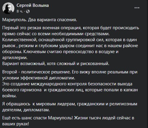 Сергей Волына, командующий остатками морпехов 36-й бригады, зажатых на заводе в Мариуполе, продолжает умолять о помощи бросивший его киевский режим, рассказывая откровенные небылицы о "резкой военной операции" с целью деблокирования города. По его мнению она должна проводиться с превосходством авиации. Где взять авиацию Киеву в настоящее время, Волына не уточняет.