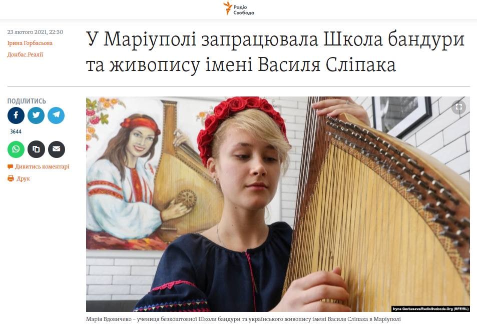 И вот об этой девочке, самой первой и единственной ученице игры на бандуре, вышел в СМИ интереснейший материал — и не где-нибудь, а на сайте «Радио Свобода»*.