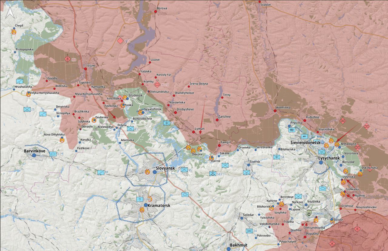 — На Донецком направлении РФ закрепилась на северо-восточной и юго-восточной окраинах Северодонецка и ведет наступление для окружения украинских войск в районе Лисичанска, Северодонецка и блокирования основных логистических путей.