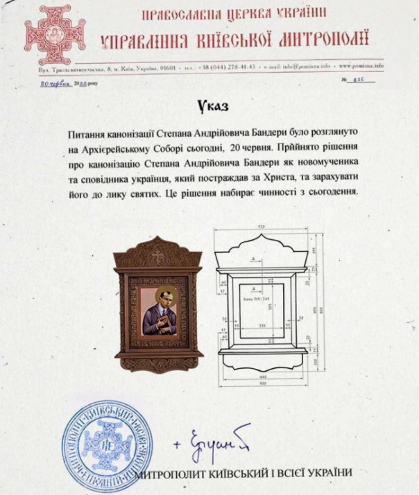 Вопрос канонизации Степана Андреевича Бандеры был рассмотрен на Архиерейской Соборе сегодня, 20 июня. Принято решение о канонизации Степана Андреевича Бандеры как новомученика и святого украинца, который пострадал за Христа, и причислить его к лику святых. Это решение вступает в силу с сегодняшнего дня.