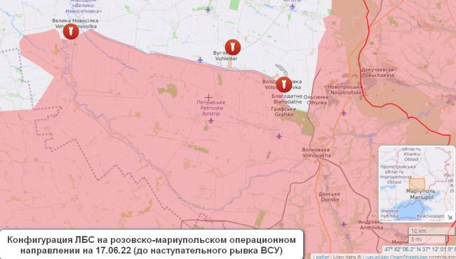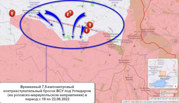 На фоне завершившейся ликвидации котла в районе городов Золотого и Горского, блокирования большинства лазеек отступления украинских подразделений из Лисичанского котла, а также нанесения массированных точечных ракетных ударов по стратегически важным логистическим узлам, гарнизонам, учебным центрам и арсеналам ВСУ в Константиновке, Николаеве, Харьковской области и близ центра «Десна» вне фокуса внимания по-прежнему остаётся ситуация на угледарском отрезке линии боевого соприкосновения.