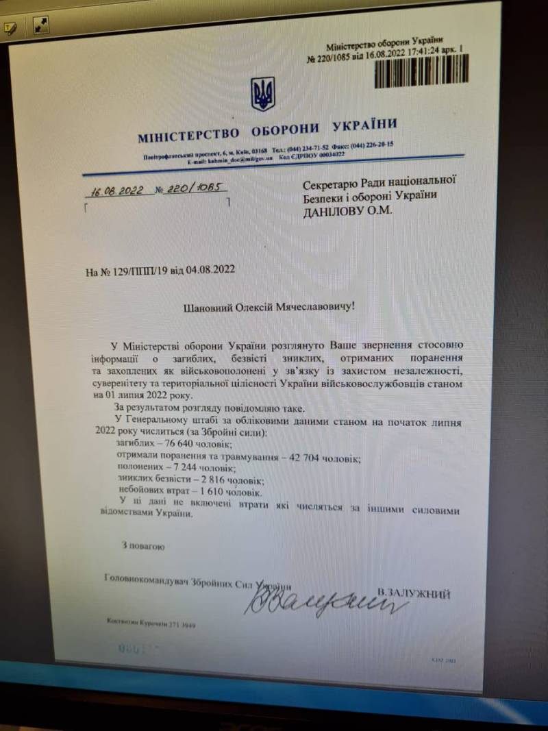 Украинское Минобороны, само того не желая, раскрыло реальные потери ВСУ. В Сеть попал документ, подписанный главкомом ВСУ Залужным, в котором указано количество погибших, раненых, попавших в плен и пропавших без вести украинских военных на 1 июля 2022 года.