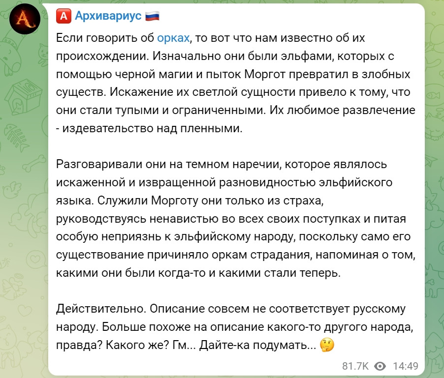 Немалое количество проживающих на Украине (в ее центральных и северных областях) «эльфов» есть среди знакомых и у автора этих строк. Почему «эльфов»? Да просто с началом СВО, благодаря самым ходульным штампам киевской пропаганды, союзные войска, участвующие в процессе денацификации «великой европейской державы», тут же были «перекрещены» в «орков».