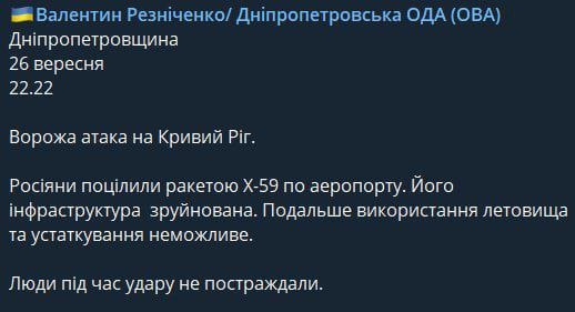 «Россияне попали по аэропорту. Его инфраструктура разрушена. Дальнейшее использование аэродрома и оборудования невозможно. Люди во время удара не пострадали», - заявил глава Днепропетровской ОВА В. Резниченко.
