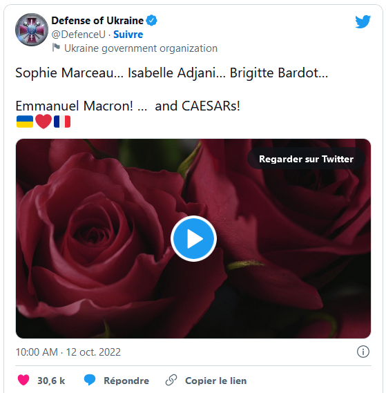 При этом само видео предваряет надпись: «Софи Марсо... Изабель Аджани... Бриджит Бардо... Эммануэль Макрон! ... и «Цезари»!», — такой неуместный ряд симпатий выстроили пиарщики ВСУ, объединив имена звезд французского кино с президентом Франции, снабжающим Украину оружием, и смертоносными системами «Цезарь». «Большое спасибо, Франция», — завершается французский клип с фотографиями президентов Франции и Украины, а затем продолжается на английском: «Пришлите еще, пожалуйста».