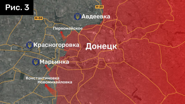 На донецком фронте Вооружённые Силы РФ вновь вели штурмовые действия в районе Новомихайловки с целью выхода на Константиновку, где проходит важная автомобильная развязка. Также очередная наземная атака на укрепрайон ВСУ в Марьинке. Севернее российские войска пытались продвинуться у Первомайского. (Рис. 3)