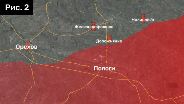 На запорожском участке российская артиллерия била по Орехову. Там ВСУ сосредотачивают силы для возможного наступления. Также прилёты в Железнодорожное и Дорожнянку. А чуть восточнее – опять Малиновка. Правда, власть там давно не менялась. Село за ВСУ. (Рис. 2)