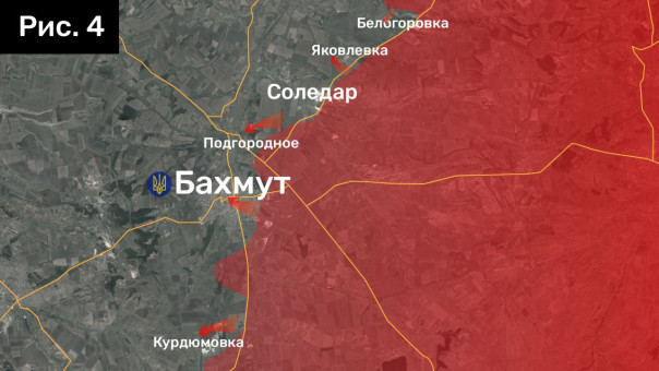 К югу от Бахмута ЧВК «Вагнер» на земле атаковали Курдюмовку. Продолжаются ожесточённые бои и на восточных окраинах самого города. А к северу российские войска атаковали в направлении Подгородного. Таким образом, они пытаются взять украинский гарнизон в Бахмуте в полукольцо. К северо-востоку от Соледара российская армия вела штурмовые действия у Яковлевки и Белогоровки. Не путайте последний из названных населённых пунктов с одноимённым в Луганской области. Цель – перерезать рокаду. (Рис. 4)