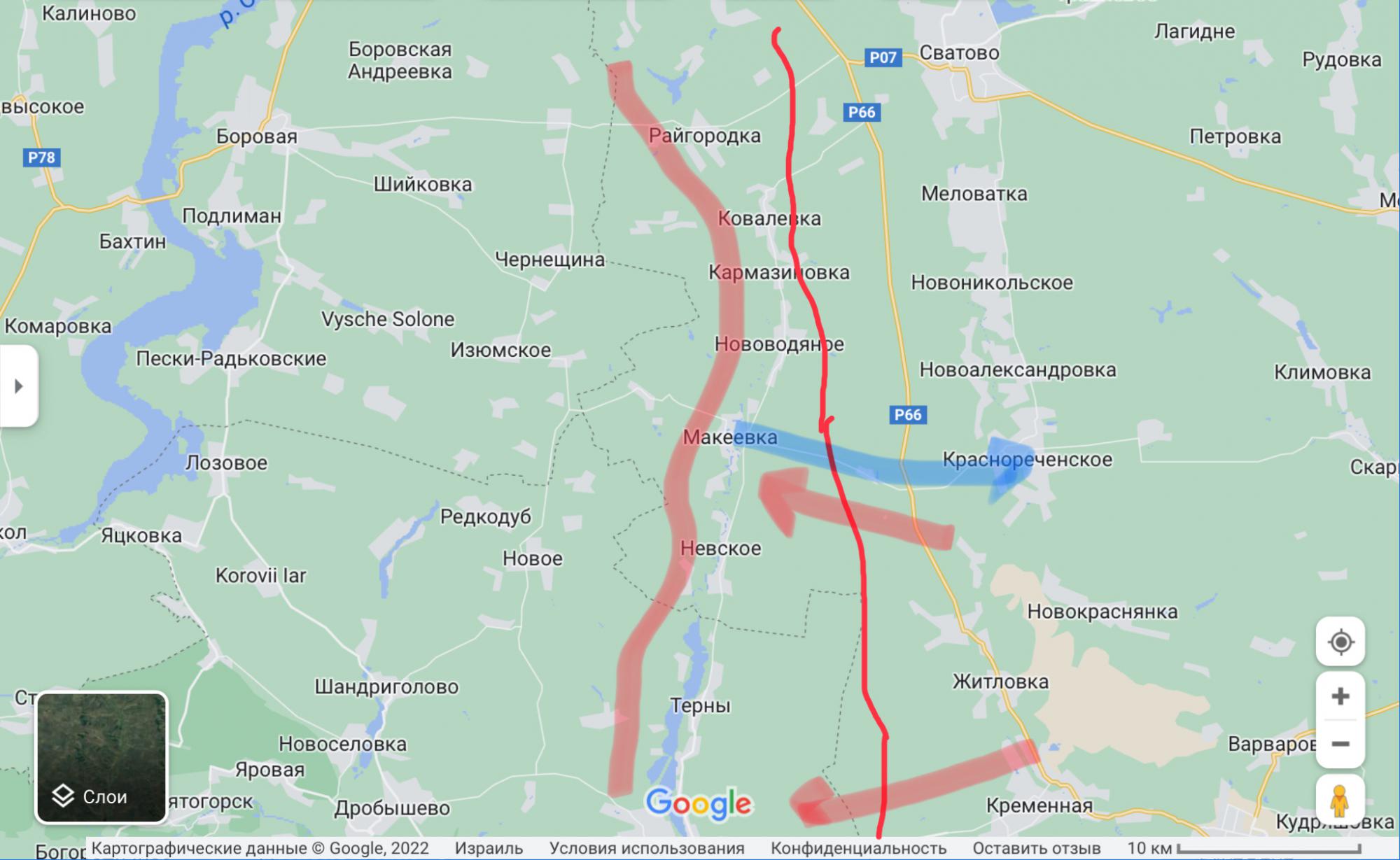 Северо-западнее Сватово, скорее всего войскам ВСУ поставлены две задачи - выход на трассу Сватово-Куземовка одной из наступающих групп, и выход к Нижней Дуванке и штурм этого населенного пункта второй наступающей группой (той что движется от Купянска.