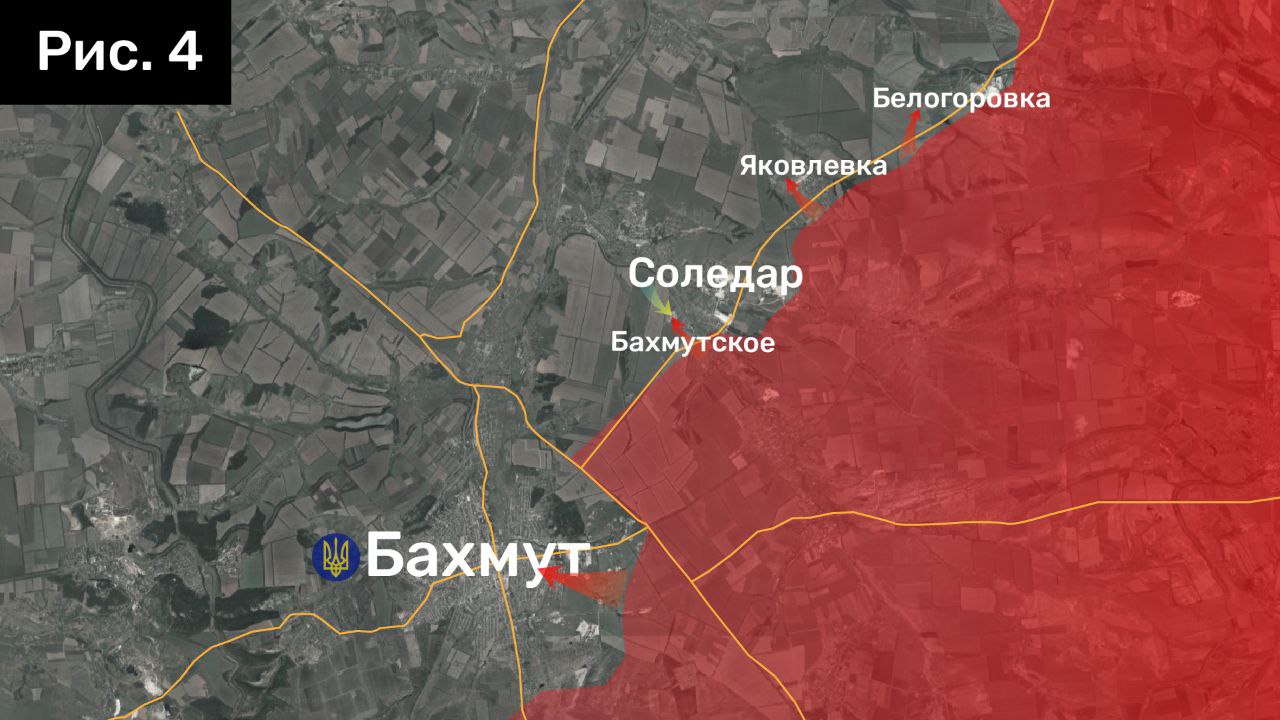ЧВК «Вагнер» пытается продавить оборону ВСУ на восточных окраинах Бахмута. Также они ведут тяжёлые бои к юго-востоку от Соледара у Бахмутского. Причём, они носят встречный характер. Украинская армия также пытается контратаковать. К востоку от города российские войска штурмуют Яковлевку и донецкую Белогоровку. (Рис. 4)