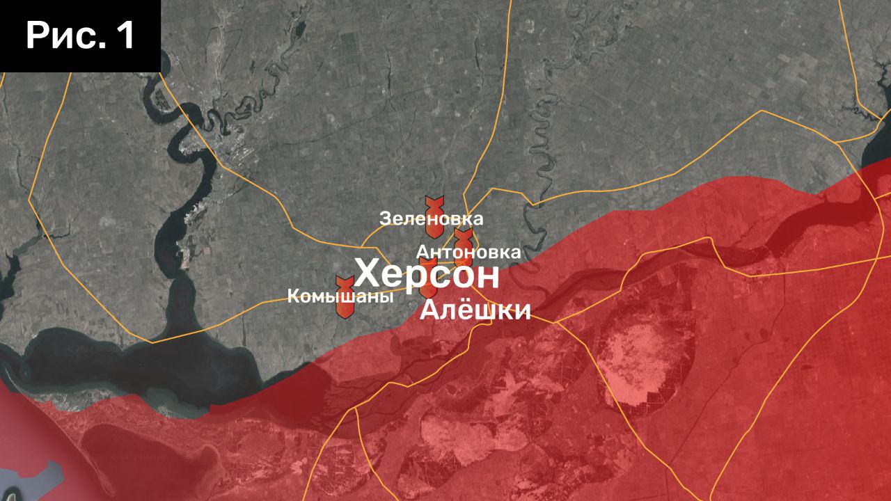 На херсонском направлении российская артиллерия нанесла массированный удар по областному центру. В городе остаётся значительный гарнизон украинской армии. Также под обстрелами оказались позиции ВСУ в Комышанах, Зеленовке и Антоновке. (Рис. 1)