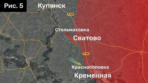 На луганском направлении уже украинская армия пытается прорваться к трассе Р-66 в районе Краснопоповки и перерезать её участок к северу от Кременной. В свою очередь, российские войска атаковали в направлении Стельмаховки. (Рис. 5)
