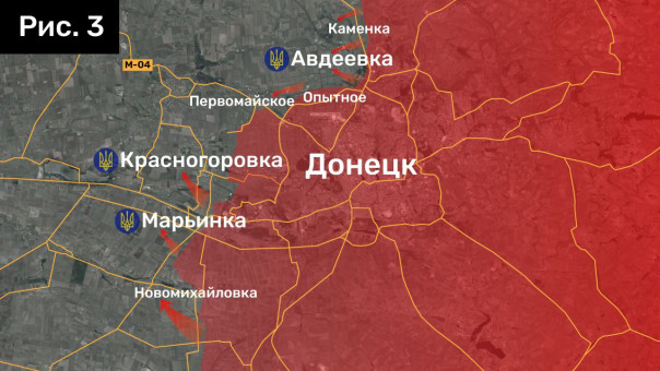Жарко на донецком фронте. Российские войска атаковали со стороны Новомихайловки. Ожесточённые наземные бои в самой Марьинке. Для ВСУ это стратегический укрепрайон. Причём, на господствующих высотах. Чуть севернее российские войска вели наступление на другой укрепрайон в Красногоровке. Также они пытаются с юга охватить и третий – в Авдеевке. Наземные атаки в районе Первомайского и со стороны ранее взятого Опытного. Удар и с севера. Российские войска вели штурмовые действия у Каменки. (Рис. 3)