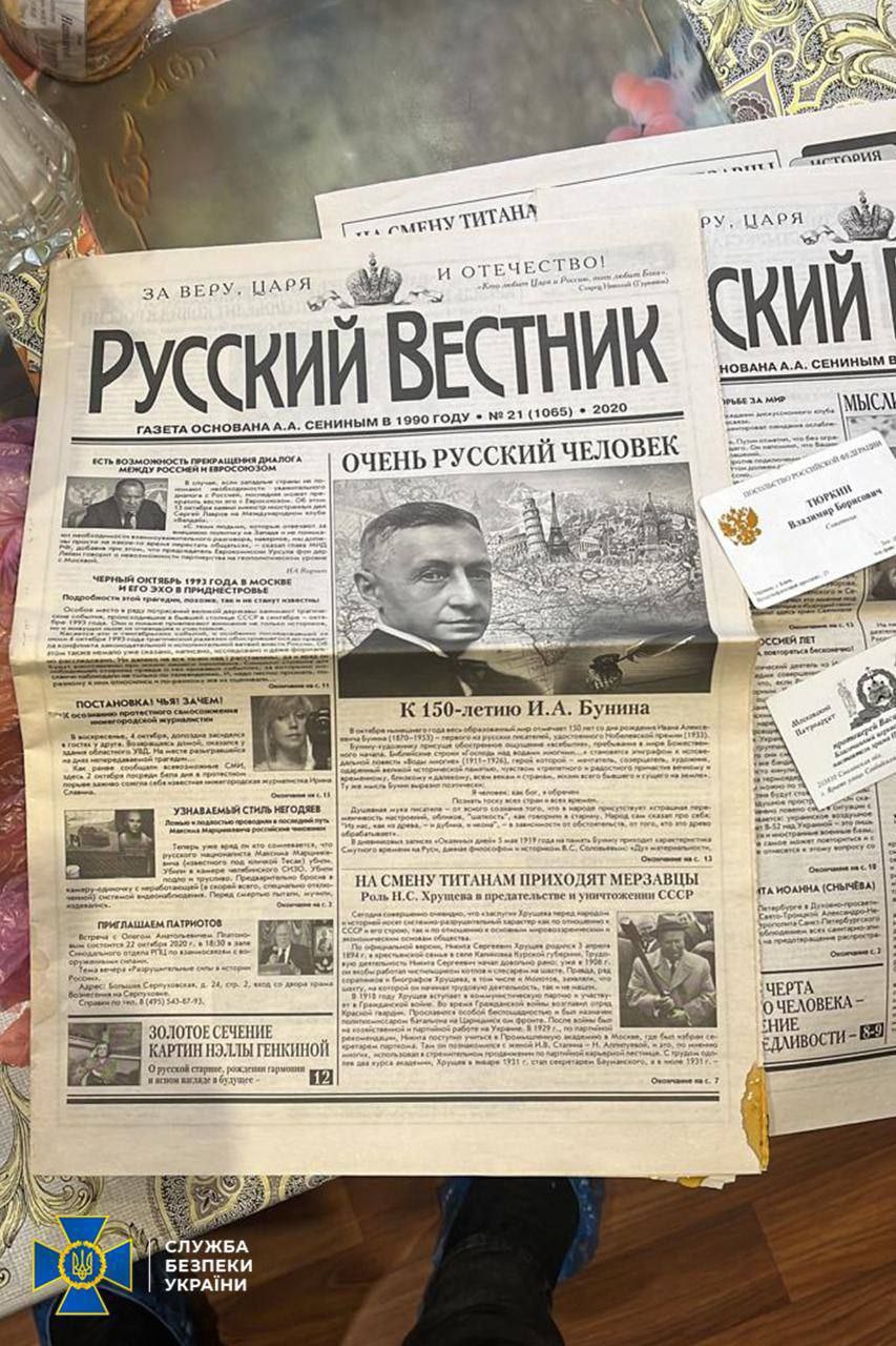 Нашли "пророссийскую литературу ", в числе улик есть журнал " Русский дом" 2014 года издания и газета «Русский Вестник», которая датируется 2020 годом. СБУ это абсолютно не смутило.