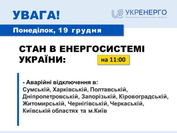 По информации компании, по состоянию на 19 декабря, в энергосистеме Украины наблюдается тяжелая ситуация. Сегодня были применены аварийные отключения в Сумской, Харьковской, Полтавской, Днепропетровской, Запорожской, Кировоградской, Житомирской, Черниговской, Черкасской, Киевской областях и самой столице Украине. Источник