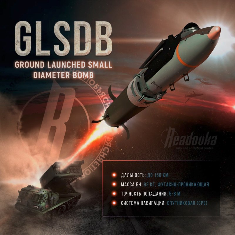 Ракеты GLSDB дальностью до 150 км — это совместная разработка Boeing и Saab Group, которая состоит из двух основных компонентов: авиабомбы и ракетного двигателя. Запускать ее можно с наземных комплексов M270 и M142 HIMARS, находящихся на вооружении ВСУ.