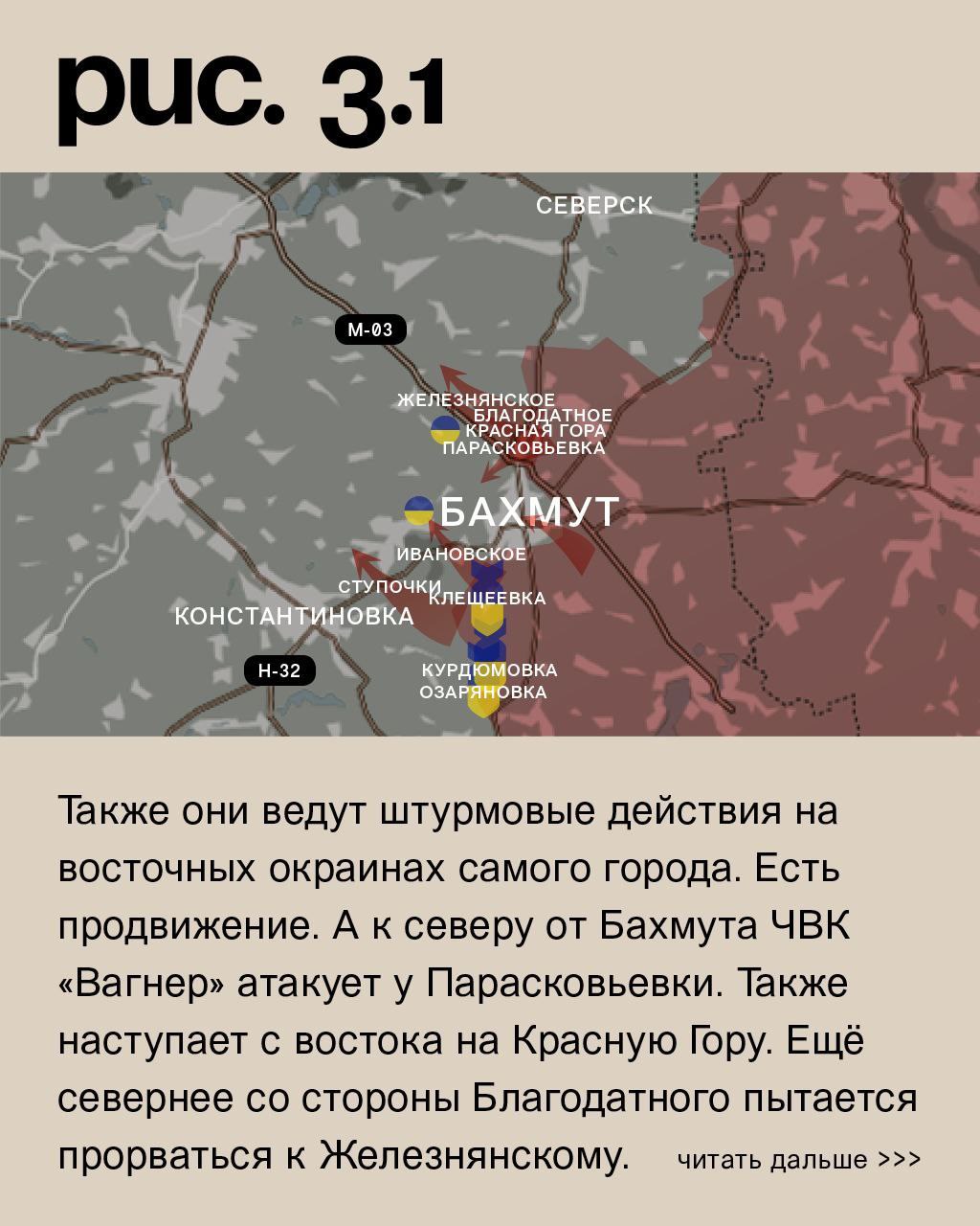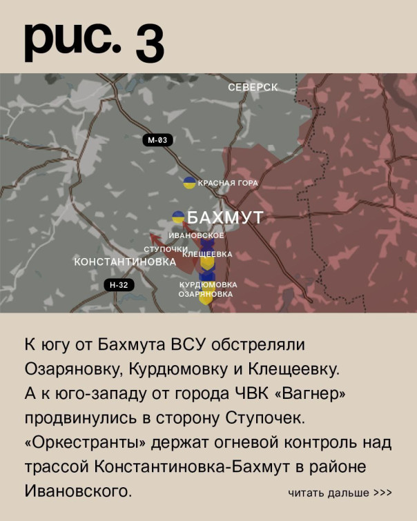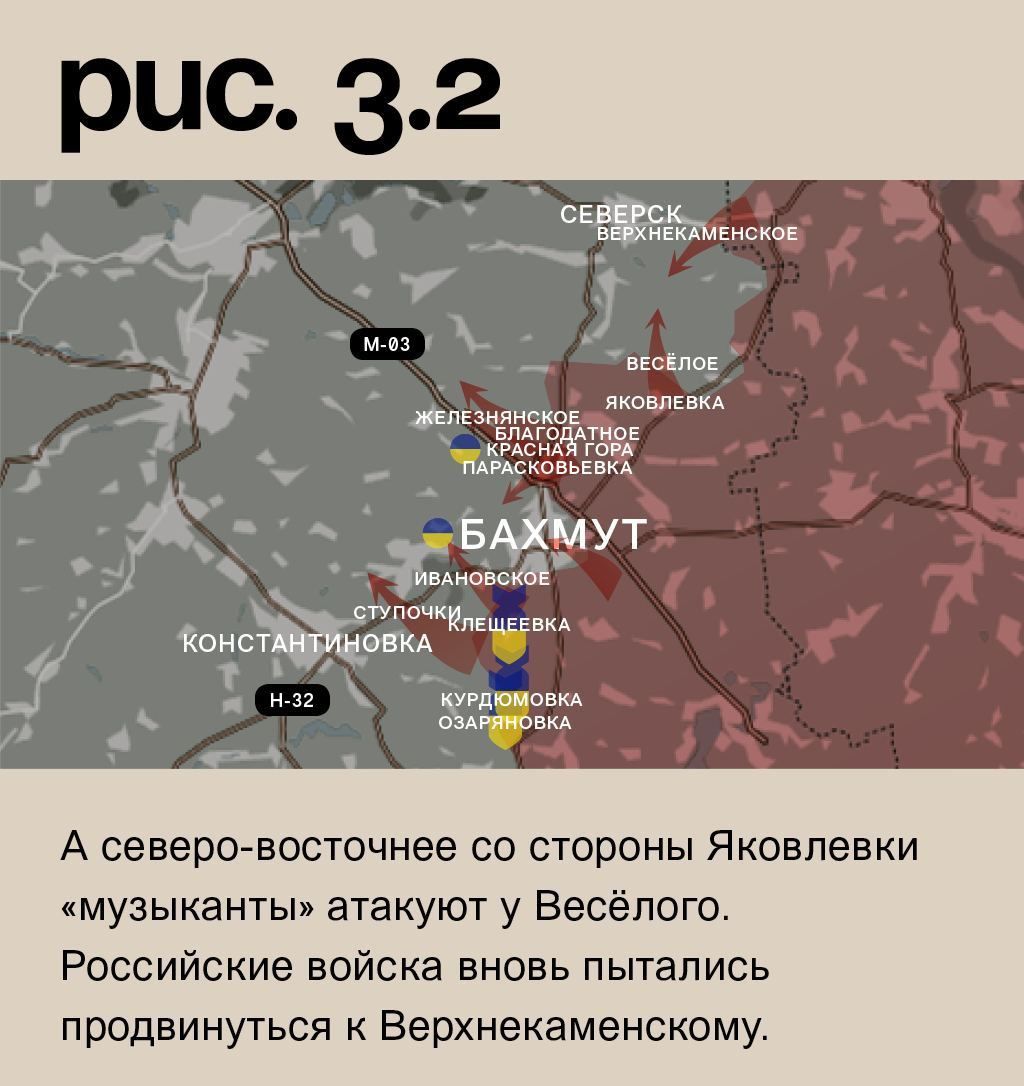 К югу от Бахмута ВСУ обстреляли Озаряновку, Курдюмовку и Клещеевку. А к юго-западу от города ЧВК «Вагнер» продвинулись в сторону Ступочек. «Оркестранты» держат огневой контроль над трассой Константиновка-Бахмут в районе Ивановского. Также они ведут штурмовые действия на восточных окраинах самого города. Есть продвижение. А к северу от Бахмута ЧВК «Вагнер» атакует у Парасковьевки. Также наступает с востока на Красную Гору. Ещё севернее со стороны Благодатного пытается прорваться к Железнянскому. А северо-восточнее со стороны Яковлевки «музыканты» атакуют у Весёлого. Российские войска вновь пытались продвинуться к Верхнекаменскому. (Рис. 3)