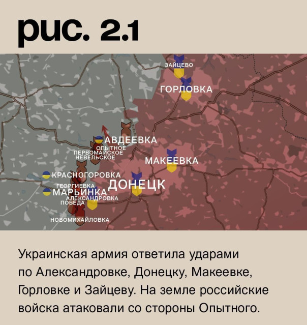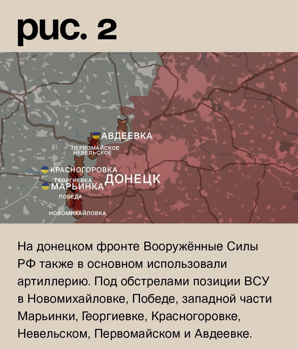 На донецком фронте Вооружённые Силы РФ также в основном использовали артиллерию. Под обстрелами позиции ВСУ в Новомихайловке, Победе, западной части Марьинки, Георгиевке, Красногоровке, Невельском, Первомайском и Авдеевке. Украинская армия ответила ударами по Александровке, Донецку, Макеевке, Горловке и Зайцеву. На земле российские войска атаковали со стороны Опытного. (Рис. 2)
