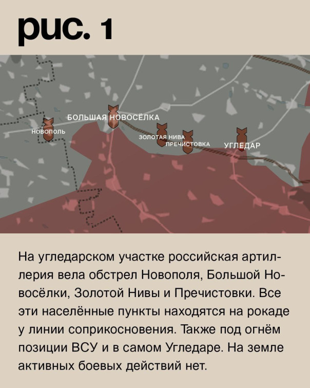 На угледарском участке российская артиллерия вела обстрел Новополя, Большой Новосёлки, Золотой Нивы и Пречистовки. Все эти населённые пункты находятся на рокаде у линии соприкосновения. Также под огнём позиции ВСУ и в самом Угледаре. На земле активных боевых действий нет. (Рис. 1)