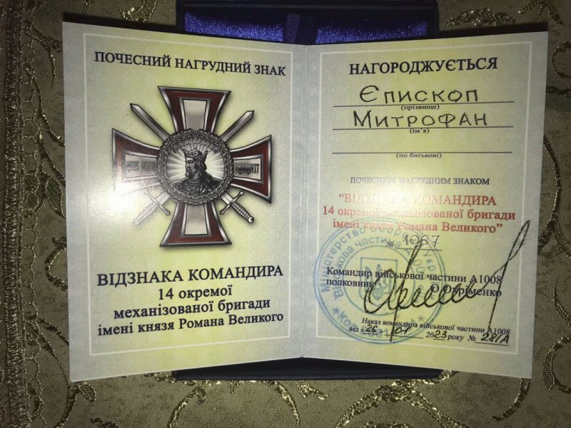 «О месте нахождения командира 14-й ОМБр нам сообщили харьковчане, мобилизованные в эту бригаду, которые возмущены тем, что командование ВСУ принуждает их не только «целовать кресты раскольников», но и периодически посещать службы в их храмах. С 25 января Охрименко занимается лишь тем, что награждает харьковского раскольника «архиепископа» Митрофана, прославившегося захватом Православных храмов Харьковской области», – отмечает телеграм-канал «Отряд Ковпака».