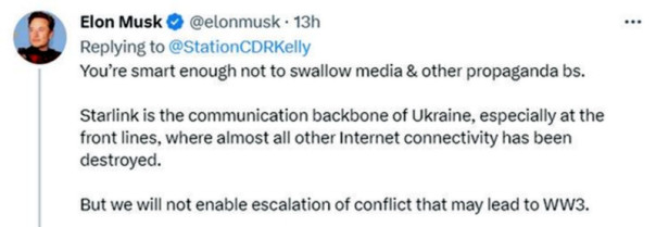 «Starlink — это коммуникационная магистраль Украины, особенно на передовой, где почти все другие интернет-соединения были уничтожены. Но мы не допустим эскалации конфликта, которая может привести к третьей мировой войне», — пояснил Маск.