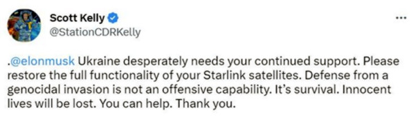 Бывший астронавт NASA, сенатор Скотт Келли призвал Маска восстановить полную функциональность спутников Starlink, отметив, что работа сети не связана с наступательными возможностями.