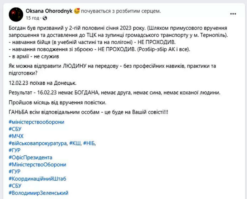 По словам тернопольчанки Оксаны Огородник, мужчина был мобилизован с остановки общественного транспорта во второй половине января. 12 февраля он уже был отправлен на передовую на Донбасс. А спустя четыре дня, 16 февраля, погиб.