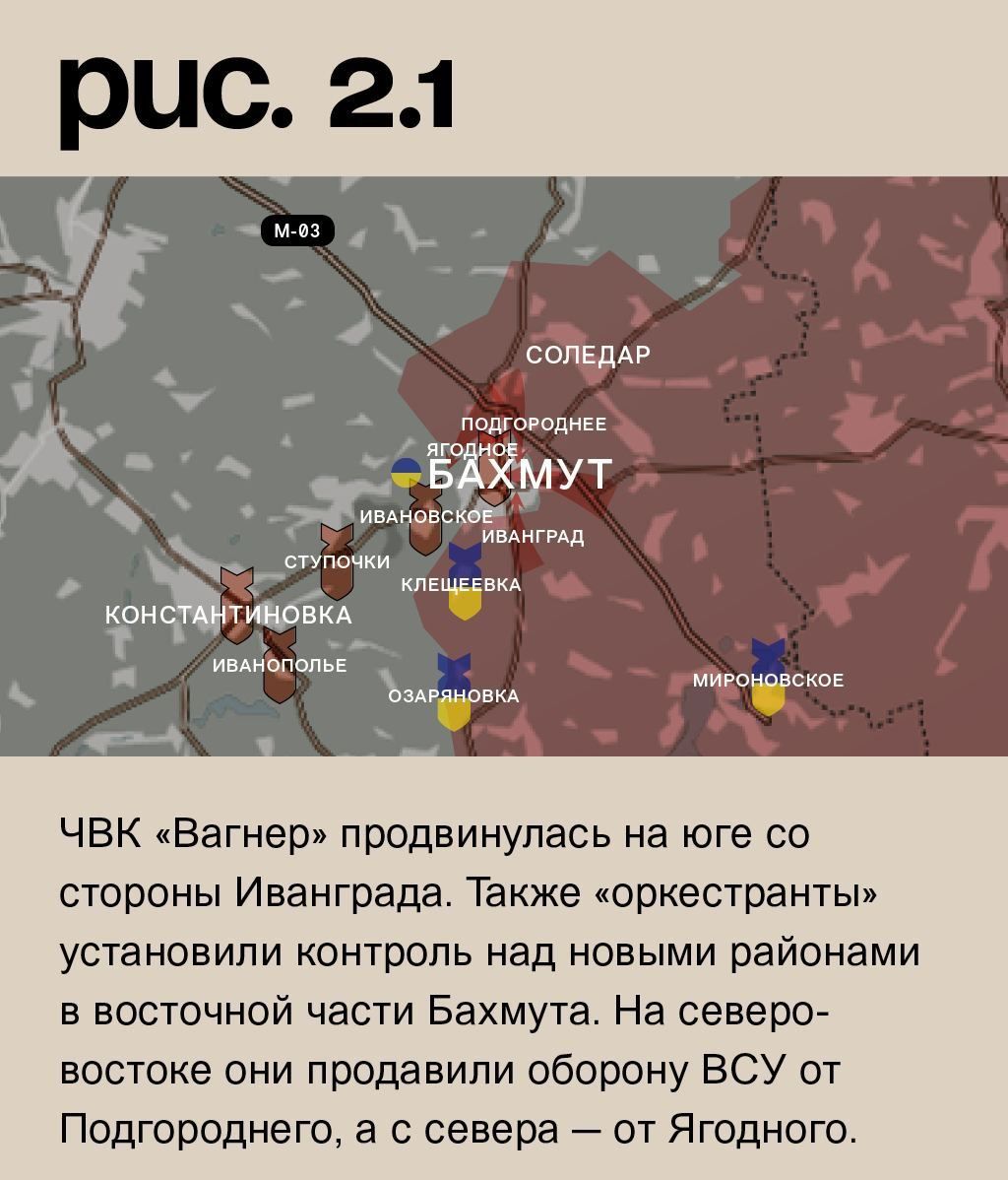 К юго-западу от Бахмута ВСУ обстреливают Озаряновку и Клещеевку. Ракетный удар по Мироновскому. Это глубокий тыл. Российская армия вела огонь по Иванополью, Константиновке, Ступочкам, Ивановскому и Бахмуту. Сам город взят в полукольцо. ЧВК «Вагнер» продвинулась на юге со стороны Иванграда. Также «оркестранты» установили контроль над новыми районами в восточной части Бахмута. На северо-востоке они продавили оборону ВСУ от Подгороднего, а с севера – от Ягодного. Но самое критическое положение украинских войск на северо-западе. Там ЧВК «Вагнер» сделала рывок к Богдановке. Таким образом, все линии снабжения ВСУ в Бахмуте под огневым контролем. «Оркестранты» также атакуют в направлении Орехово-Васильевки. К северу от Соледара стремятся прорваться к Роздоловке. Чуть восточнее – к Весёлому. (Рис. 2)