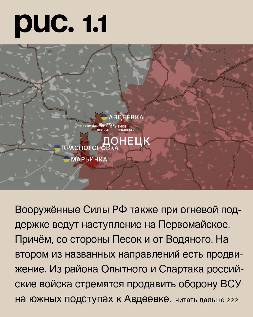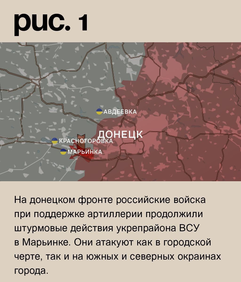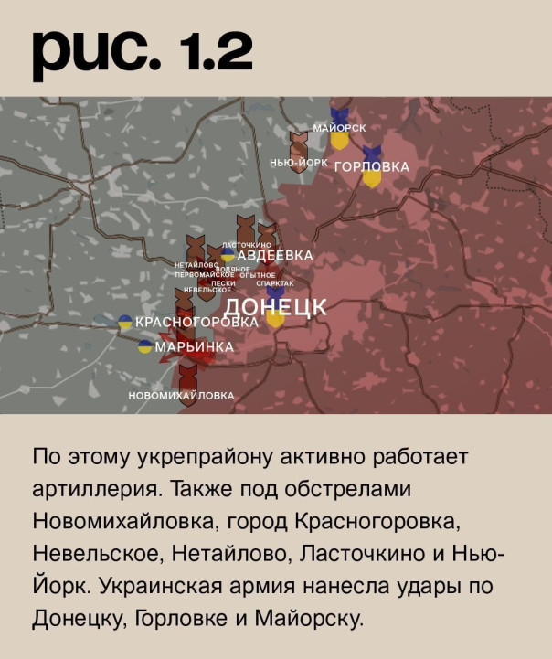 На донецком фронте российские войска при поддержке артиллерии продолжили штурмовые действия укрепрайона ВСУ в Марьинке. Они атакуют как в городской черте, так и на южных и северных окраинах города. Вооружённые Силы РФ также при огневой поддержке ведут наступление на Первомайское. Причём, со стороны Песок и от Водяного. На втором из названных направлений есть продвижение. Из района Опытного и Спартака российские войска стремятся продавить оборону ВСУ на южных подступах к Авдеевке. По этому укрепрайону активно работает артиллерия. Также под обстрелами Новомихайловка, город Красногоровка, Невельское, Нетайлово, Ласточкино и Нью-Йорк. Украинская армия нанесла удары по Донецку, Горловке и Майорску. (Рис. 1)