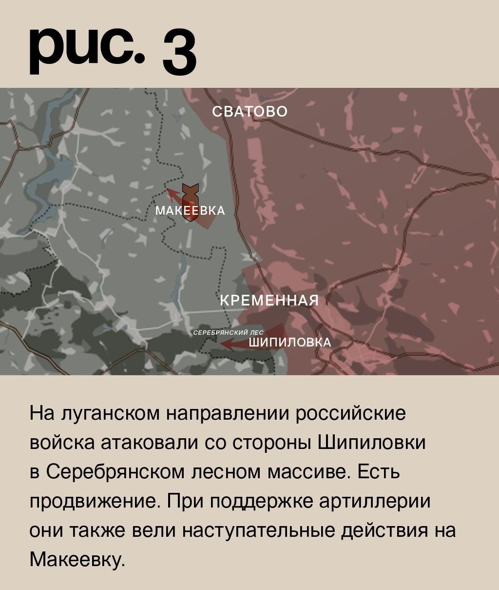 На луганском направлении российские войска атаковали со стороны Шипиловки в Серебрянском лесном массиве. Есть продвижение. При поддержке артиллерии они также вели наступательные действия на Макеевку. (Рис. 3)