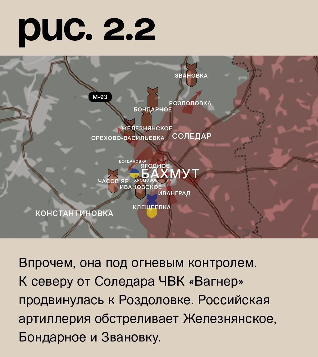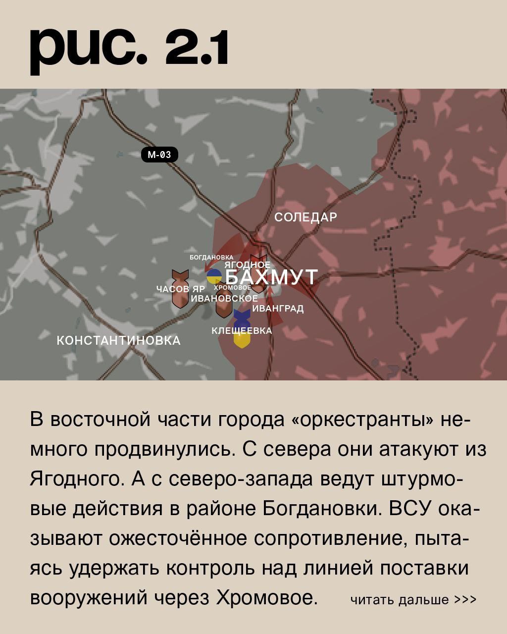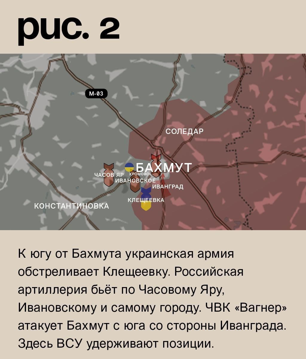 К югу от Бахмута украинская армия обстреливает Клещеевку. Российская артиллерия бьёт по Часовому Яру, Ивановскому и самому городу. ЧВК «Вагнер» атакует Бахмут с юга со стороны Иванграда. Здесь ВСУ удерживают позиции. В восточной части города «оркестранты» немного продвинулись. С севера они атакуют из Ягодного. А с северо-запада ведут штурмовые действия в районе Богдановки. ВСУ оказывают ожесточённое сопротивление, пытаясь удержать контроль над линией поставки вооружений через Хромовое. Впрочем, она под огневым контролем. К северу от Соледара ЧВК «Вагнер» продвинулась к Роздоловке. Российская артиллерия обстреливает Железнянское, Бондарное и Звановку. (Рис. 2)