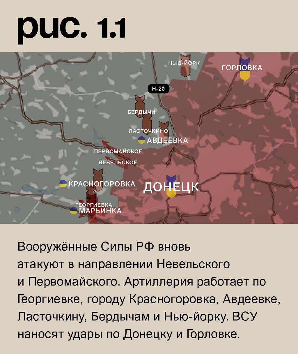 На донецком фронте российские войска при поддержке артиллерии продолжают штурмовые действия в городской черте Марьинки, а также на южных и северных окраинах города. Их интенсивность несколько уменьшилась. Вооружённые Силы РФ вновь атакуют в направлении Невельского и Первомайского. Артиллерия работает по Георгиевке, городу Красногоровка, Авдеевке, Ласточкину, Бердычам и Нью-йорку. ВСУ наносят удары по Донецку и Горловке. (Рис. 1)