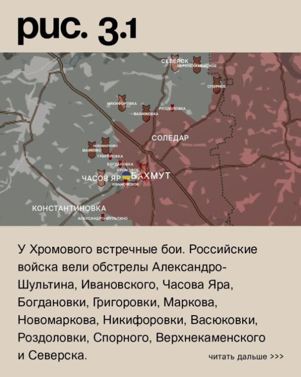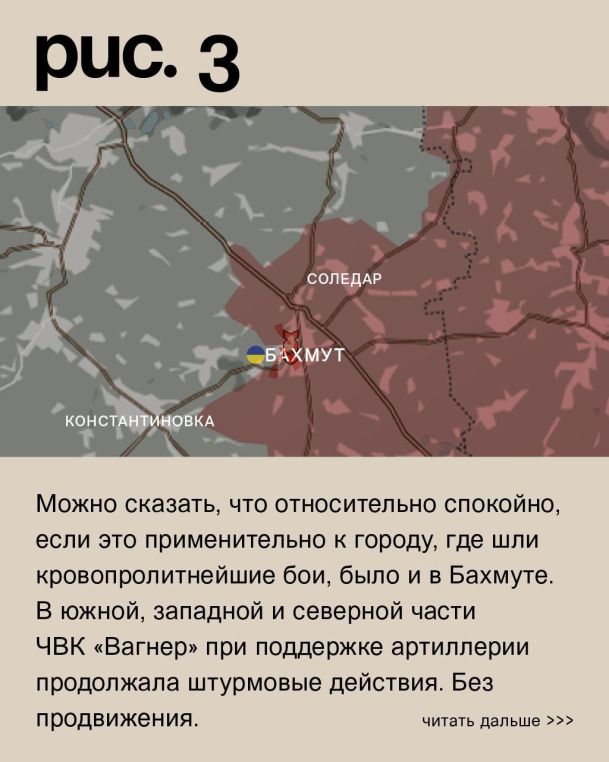 Можно сказать, что относительно спокойно, если это применительно к городу, где шли кровопролитнейшие бои, было и в Бахмуте. В южной, западной и северной части ЧВК «Вагнер» при поддержке артиллерии продолжала штурмовые действия. Без продвижения. У Хромового встречные бои. Российские войска вели обстрелы Александро-Шультина, Ивановского, Часова Яра, Богдановки, Григоровки, Маркова, Новомаркова, Никифоровки, Васюковки, Роздоловки, Спорного, Верхнекаменского и Северска. (Рис. 3)