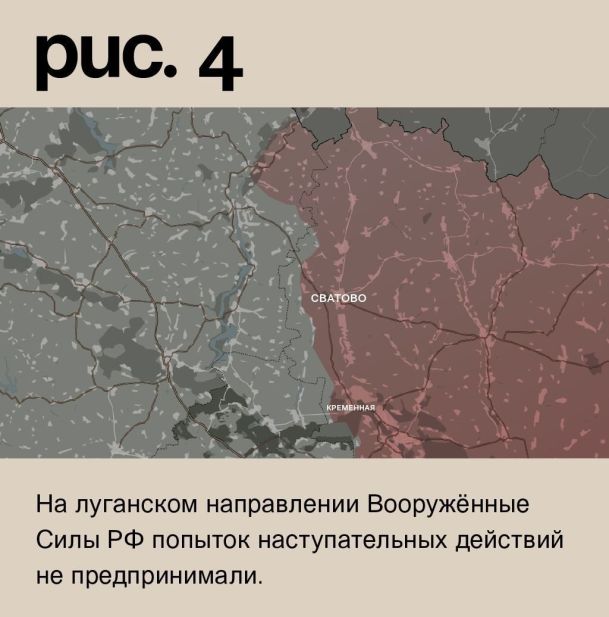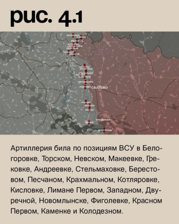 На луганском направлении Вооружённые Силы РФ попыток наступательных действий не предпринимали. Артиллерия била по позициям ВСУ в Белогоровке, Торском, Невском, Макеевке, Грековке, Андреевке, Стельмаховке, Берестовом, Песчаном, Крахмальном, Котляровке, Кисловке, Лимане Первом, Западном, Двуречной, Новомлынске, Фиголевке, Красном Первом, Каменке и Колодезном. (Рис. 4)