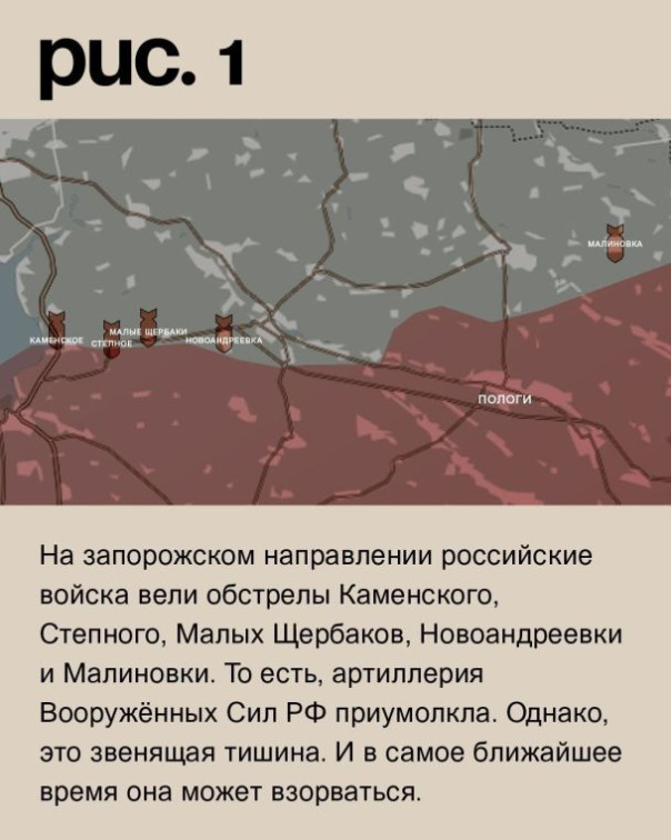 На запорожском направлении российские войска вели обстрелы Каменского, Степного, Малых Щербаков, Новоандреевки и Малиновки. То есть, артиллерия Вооружённых Сил РФ приумолкла. Однако, это звенящая тишина. И в самое ближайшее время она может взорваться. (Рис. 1)