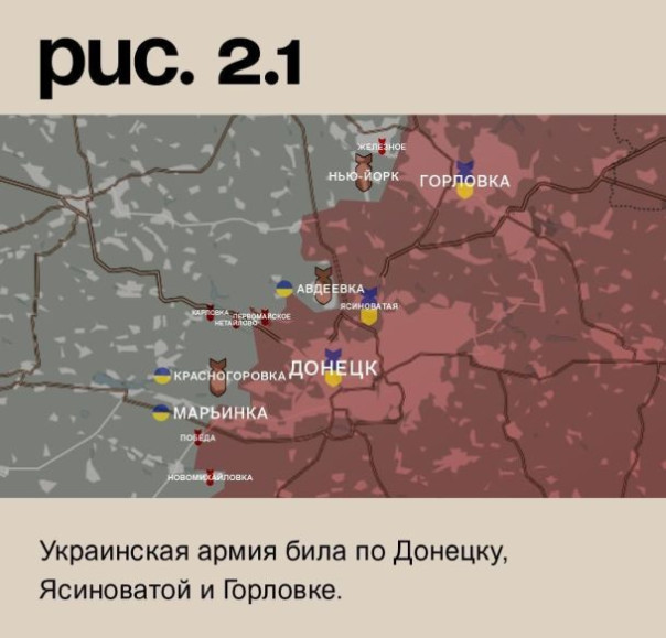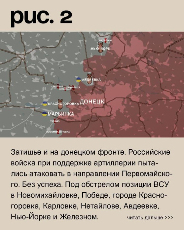 Затишье и на донецком фронте. Российские войска при поддержке артиллерии пытались атаковать в направлении Первомайского. Без успеха. Под обстрелом позиции ВСУ в Новомихайловке, Победе, городе Красногоровка, Карловке, Нетайлове, Авдеевке, Нью-Йорке и Железном. Украинская армия била по Донецку, Ясиноватой и Горловке. (Рис. 2)