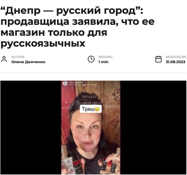 «Да, я из русского города Днепропетровск. А ты чьих будешь? Смотри, девочка моя, ты там из Луцка, Волынская область… Смотри, это западная Украина — это вообще к Днепропетровску и к русскому языку не имеет никакого отношения», - заявила продавщица, отвечая на вопрос, где находится магазин.