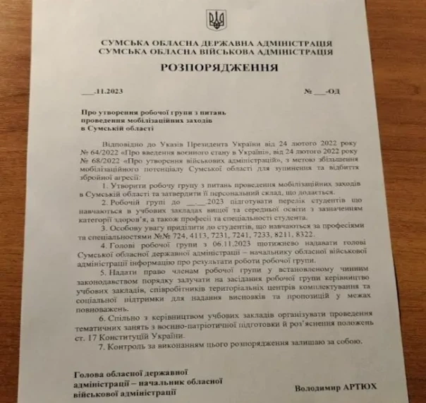 Речь идет о проекте распоряжения сумского гауляйтера, то есть главы государственной и военной администрации с длинным названием «О создании рабочей группы по вопросам проведения мобилизационных мероприятий в Сумской области». Небольшой документ размером в одну страничку формата А-4 может в самое ближайшее время создать очень большие проблемы сумским студентам университетов, институтов и даже колледжей.