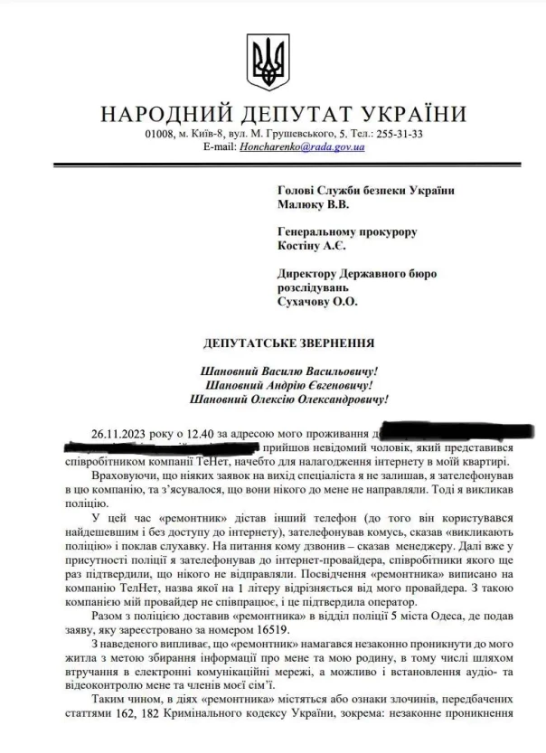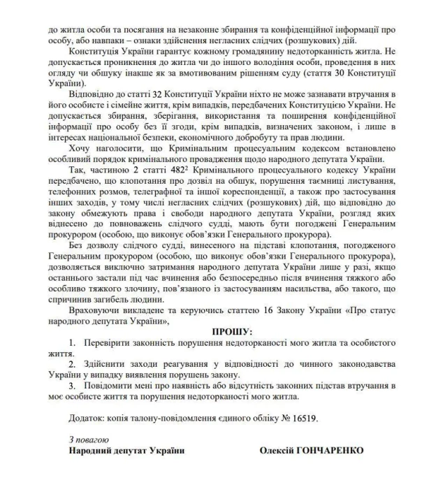 «Обратился к главе СБУ, Генпрокурору и директору ДБР, чтобы были проверены и установлены законные основания таких действий. Поскольку, согласно закону, разрешение на обыски или любые другие следственные действия в отношении народного депутата могут быть только с разрешения следственного судьи на основании ходатайства, согласованного Генеральным прокурором».