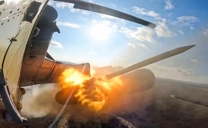 На фото: ударный вертолет Ка-52 ВКС России на Донецком направлении во время боевой работы по уничтожению опорных пунктов и бронированной техники ВСУ