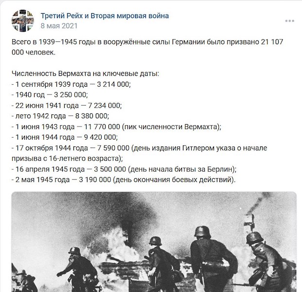 На скрине ниже мы видим таблицу численности гитлеровской армии в ключевых точках войны. Как мы видим, своей максимальной численности она достигла между началом лета 1943 и летом 1944 годов. То есть с начала войны и до самой Курской битвы она росла, а потом начала довольно заметно уменьшаться. Причем, во второй половине 1944 года, когда по сути рухнул фронт в Белоруссии и Красная армия очутилась на Висле, Гитлер начал призывать 16-летних подростков и стариков в отряды Фолькштурма (всего туда было набрано до 1,5 млн. чел.). Одновременно с этим в армию начали привлекать и большое количество женщин. К середине ноября 1944 года их насчитывалось около 300 тыс., а к концу войны было призвано еще почти 200 000. И все это привело к резкому падению качества армии.