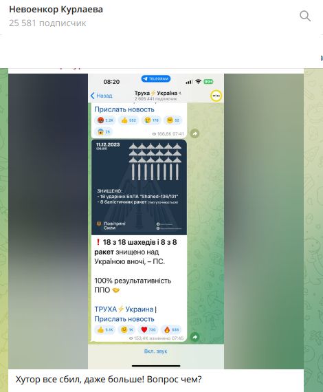 И военные ответили. Как обычно, потчевали народ сказками о мощном ПВО, которое якобы все цели сбили. В частности, Воздушные силы ВСУ, не моргнув глазом, заявили, что "поразили все враждебные цели (окончательно тип и количество ракет сообщат позже)".