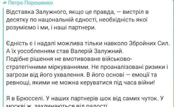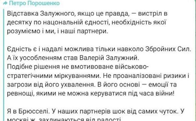 «Отставка Залужного, если это правда, — выстрел в десятку по национальному единству, необходимость которого понимаем и мы, и наши партнеры. Единство возможно только вокруг Вооруженных Сил. А их олицетворением стал Валерий Залужный. Подобное решение не мотивировано военно-стратегическими соображениями. Не проанализированы риски и угрозы его принятия. В его основе — эмоции и ревность, которыми нельзя руководствоваться во время войны!