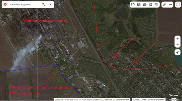 Для понимания - эта "стелла" установлена на ЗАПАДНОМ въезде в Авдеевку. То есть (с нашей точки зрения) уже за городом. И то расстояние, которое Бутусовым указано соответствует примерно жд путям. То есть жилые кварталы восточнее, по данным украинских источников уже под нами...