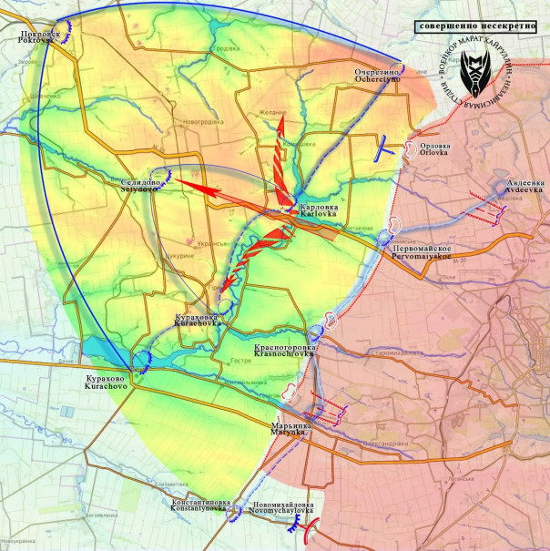 После разгрома основных укрепрайонов укропов под Донецком (Авдеевка-Первомайское-Красногоровка-Марьинка-Константиновка), на которых держится вся их оборона, наши войска выходят на рубеж Курахово-Покровское и разрезают все силы ВСУ на две части, не сообщающиеся друг с другом.
