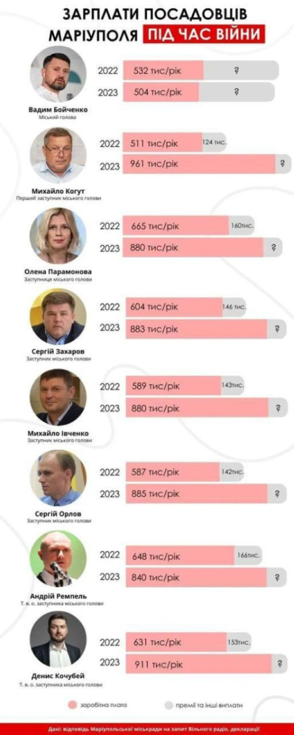 Кроме того, «мэр» и его как бы коллеги продолжают получать зарплату за исполнение своих обязанностей по управлению Мариуполем. И зарплаты эти весьма и весьма серьёзные! Украинские СМИ обнародовали зарплаты мариупольских чиновников – мэра и семи его заместителей. За 2023 год эта орава получила только голых окладов 6 миллионов 744 тысячи гривен (или почти $175 тысяч).